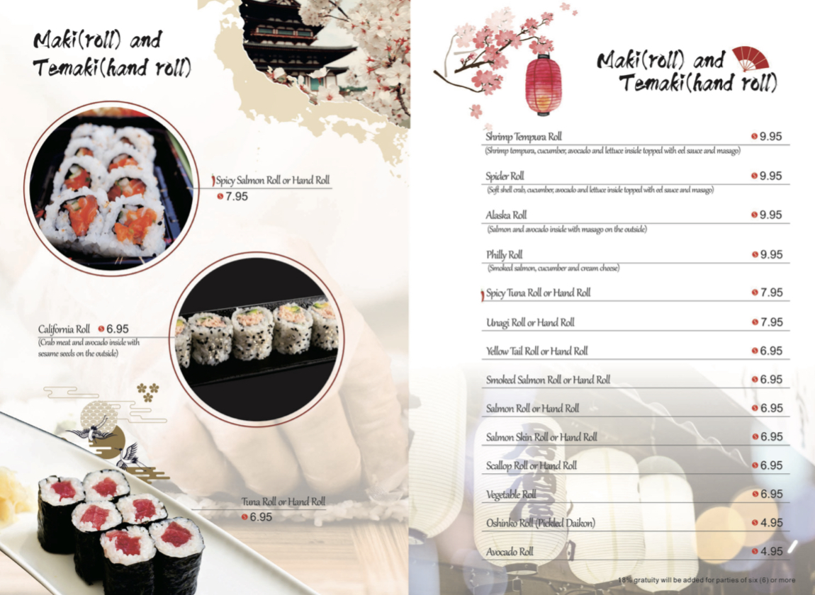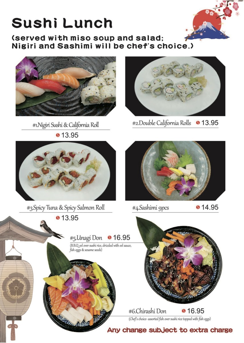 Among the highlights of their menu are the Cherry Blossom Roll and Crunchy Munchy Roll, both available for $14.95. The Cherry Blossom Roll combines spicy tuna and avocado, beautifully topped with crab meat and sauces, while the Crunchy Munchy Roll features deep-fried scallops for a satisfying crunch.